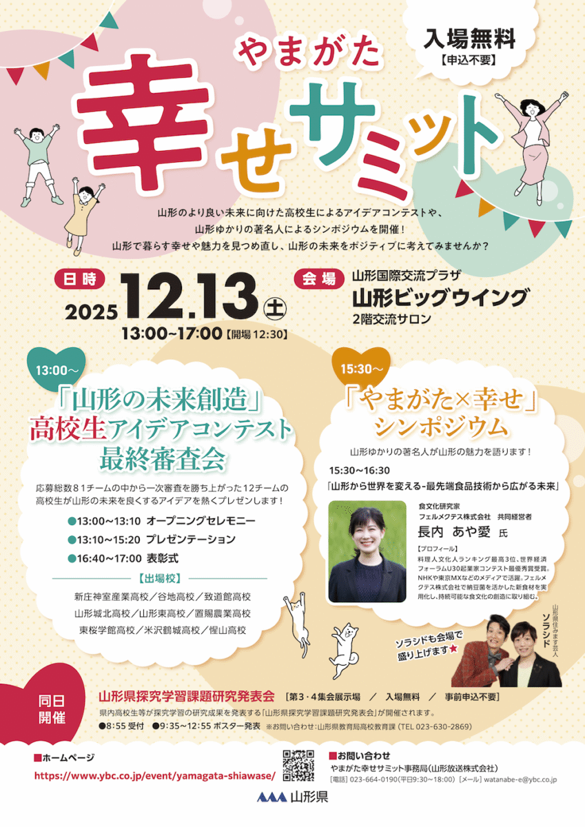 山形県が開催する「幸せサミット」は、山形で暮らす幸せや魅力を見つめ直し、山形の未来をポジティブに考えるためのイベントです。